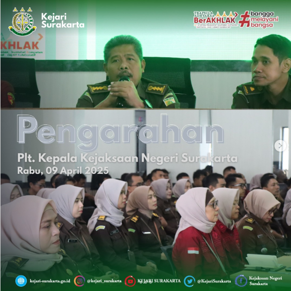 Pada hari Rabu, 9 April 2025 bertempat di Aula Digdaya Kejaksaan Negeri Surakarta telah dilaksanakan Pengarahan oleh Plt. Kepala Kejaksaan Negeri Surakarta Sunarko, SH.,MH kemudian dilanjutkan dengan bersalam – salaman bersama seluruh pegawai.