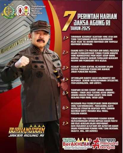 Dalam mendukung Transformasi Kejaksaan menuju Indonesia Maju, setiap insan Adhyaksa senantiasa menjalankan tugas dan kewenangannya dengan berpedoman pada 7 Perintah Harian Jaksa Agung, yaitu: