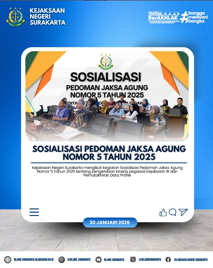 Kejaksaan Negeri Surakarta mengikuti kegiatan Sosialisasi Pedoman Jaksa Agung Nomor 5 Tahun 2025 tentang Pengelolaan Kinerja Pegawai Kejaksaan Republik Indonesia serta Pemutakhiran Data Profil Pegawai. (Jumat, 30 Januari 2026)